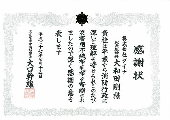 名古屋市消防局中消防署への「災害用不織布毛布」を寄贈について、名古屋市消防局中消防署から感謝状を頂きました。